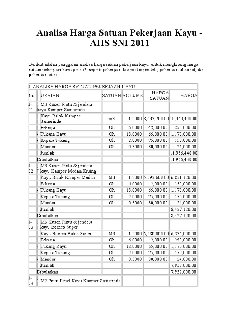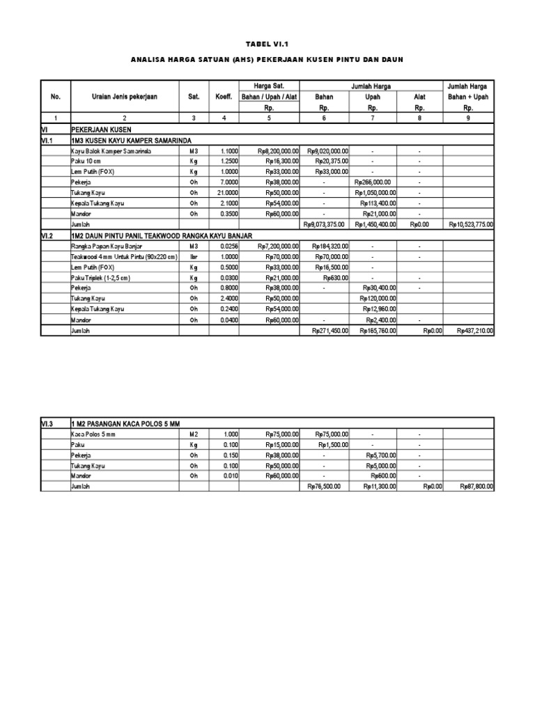 Analisa harga satuan ini berdasarkan SNI tentang tata cara perhitungan harga. Harga pintu Bengkirai memang sedikit lebih mahal. Analisa harga satuan pekerjaan AHSP Pembuatan dan pemasangan 1 m3 kusen pintu dan kusen jendela kayu kelas II atau III.