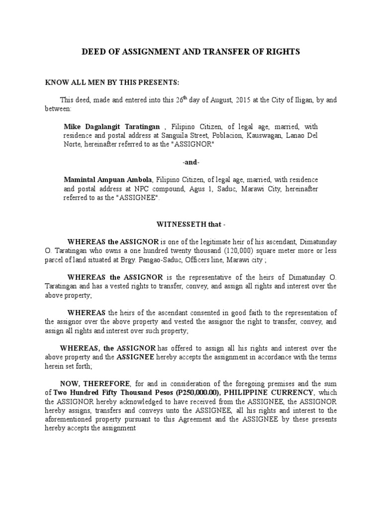 Sample Deed Of Assignment And Transfer Of Rights Template Philippines Sample Contracts